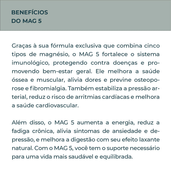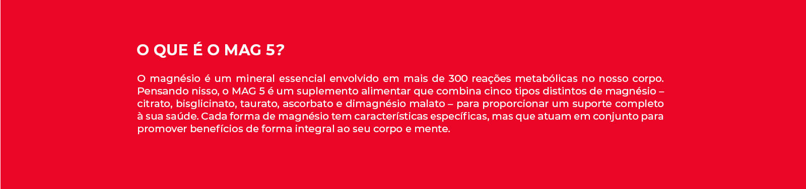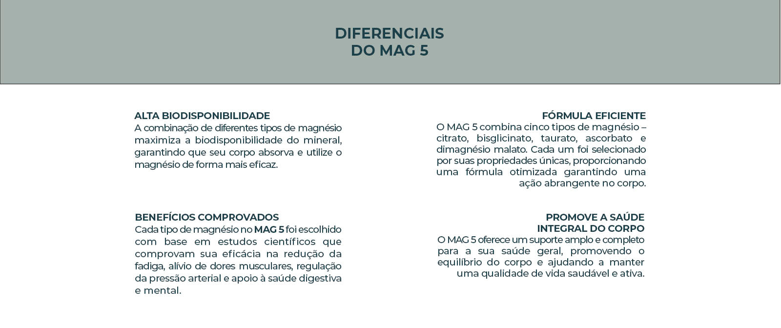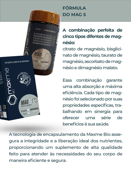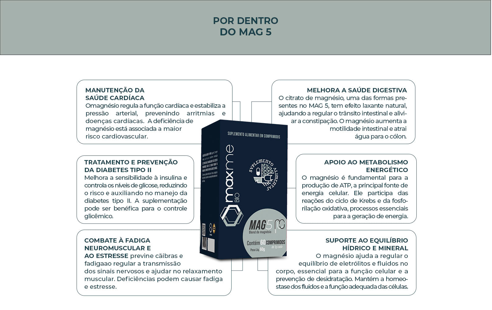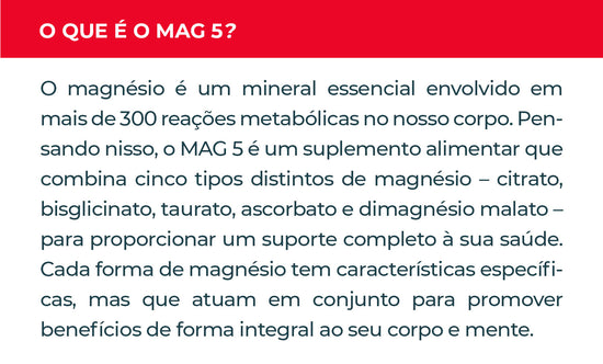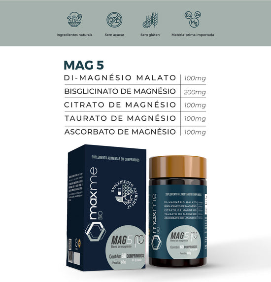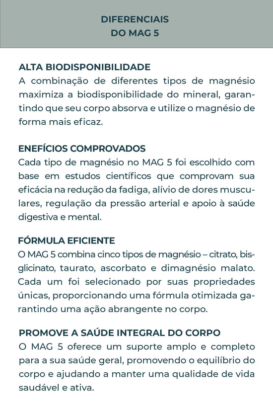 O Mag5 pode ser considerado uma das formas mais completas de suplementação de magnésio, por combinar cinco tipos altamente biodisponíveis do mineral — citrato, bisglicinato, taurato, ascorbato e di-magnésio malato — cada um com seu foco e suporte essencial em funções específicas do organismo.