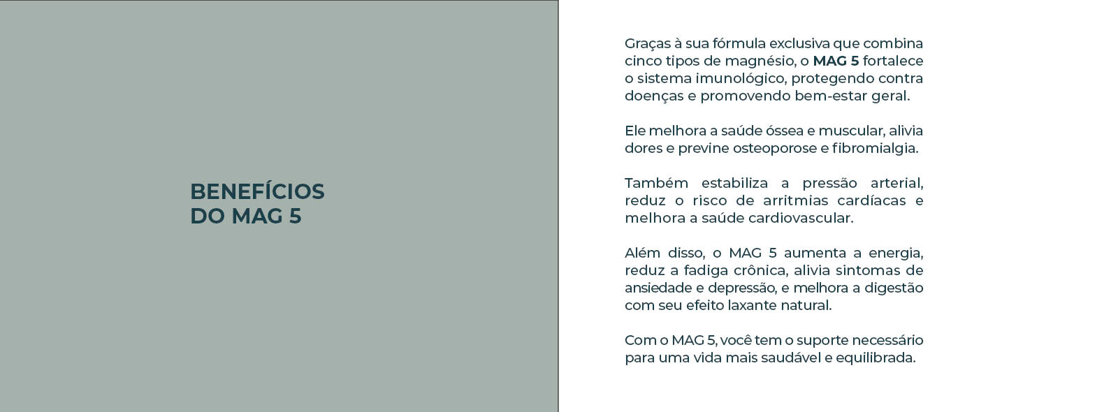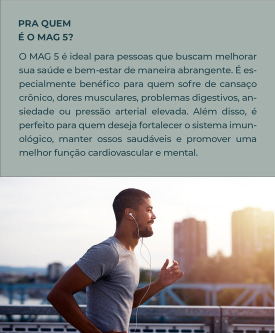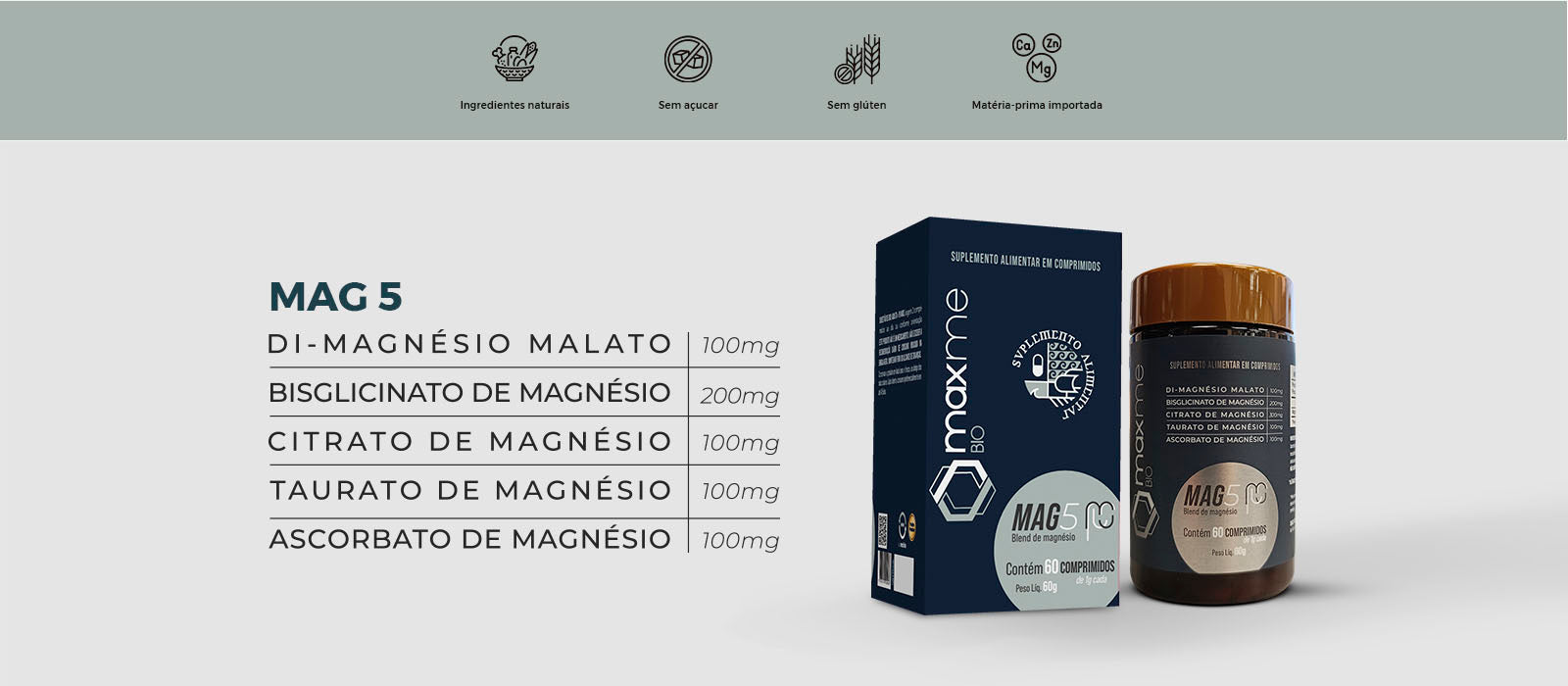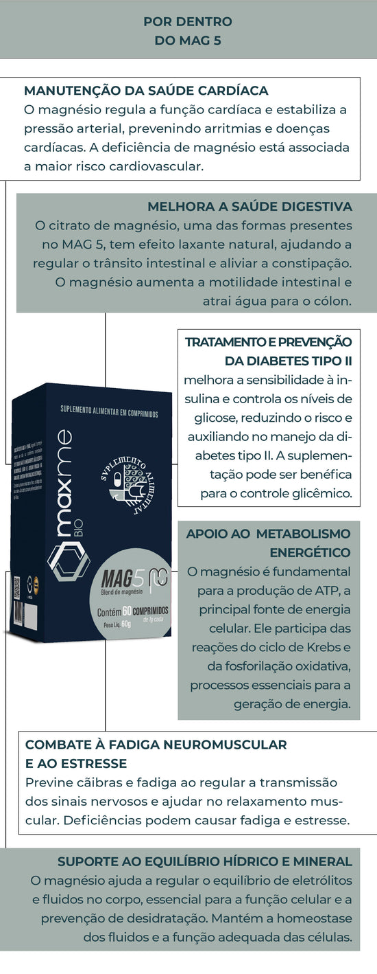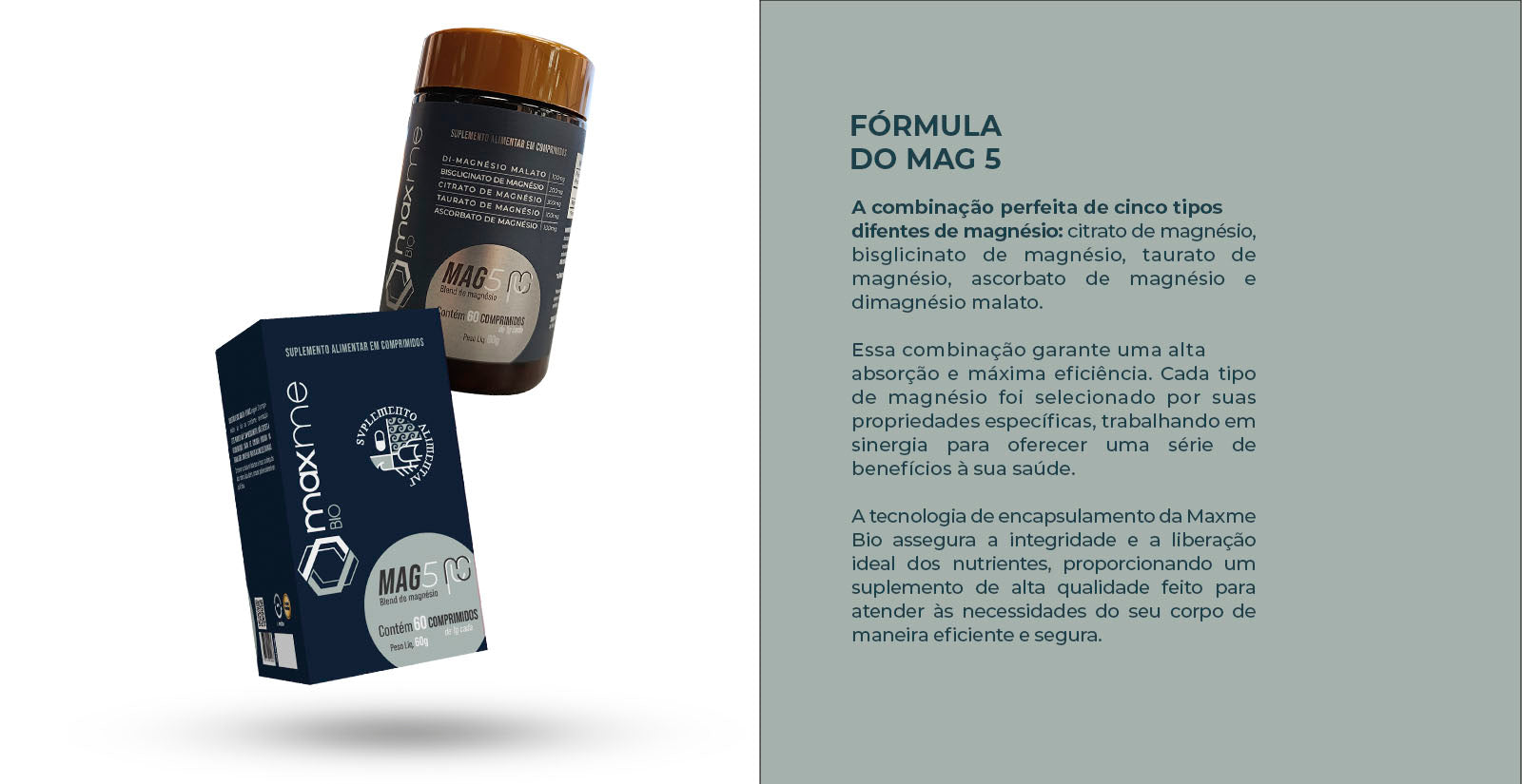 O Mag5 pode ser considerado uma das formas mais completas de suplementação de magnésio, por combinar cinco tipos altamente biodisponíveis do mineral — citrato, bisglicinato, taurato, ascorbato e di-magnésio malato — cada um com seu foco e suporte essencial em funções específicas do organismo.